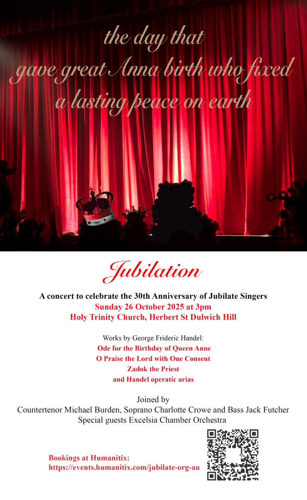 Tickets can be booked at https://events.humanitix.com/jubilate-org-au or using the QR code in the poster alongside.